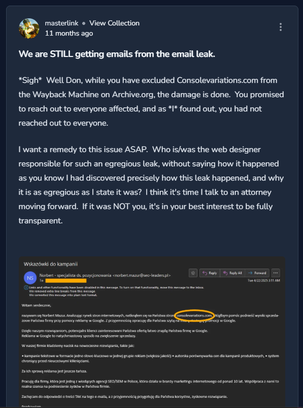 That was 11 months ago I made the last post about this. There were posts from other users and you were deleting them because you did not want to publicly admit that you had a data leak so blatant that right-clicking > View Page Source was all you needed, you could Ctrl+F and type "gmail" or "outlook" etc, and find a variety of email addresses for the pickings.